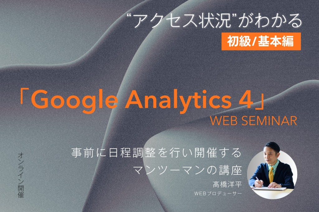 GA4オンラインセミナーのご案内です。事前に日程調整を行い開催するマンツーマンの講座になります。