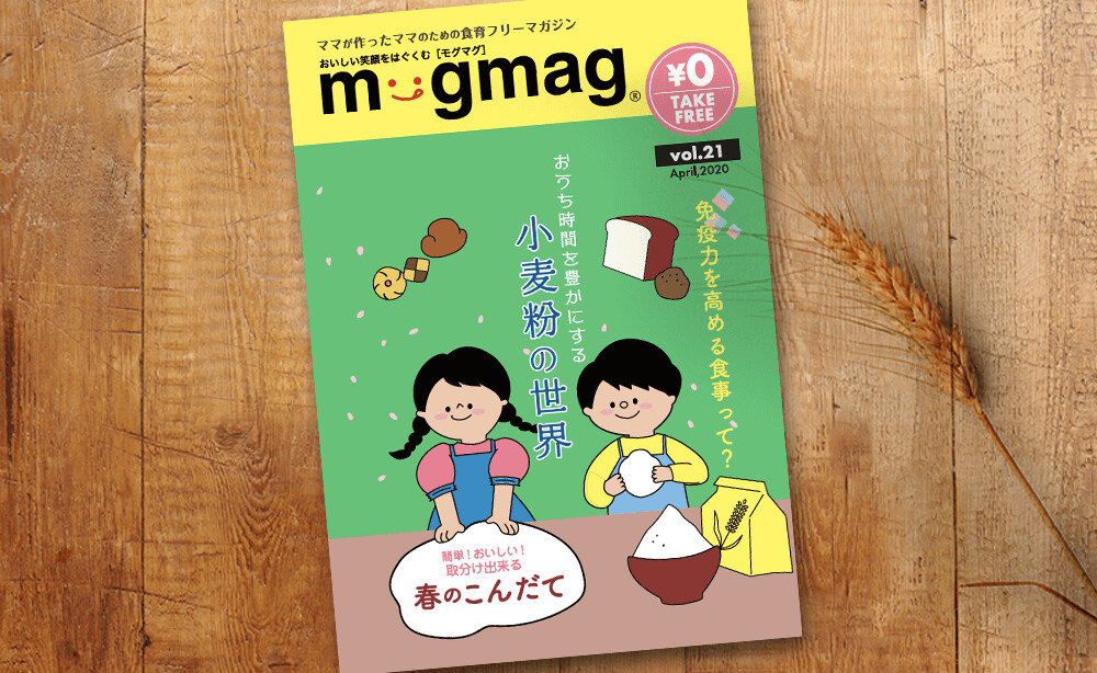 食育フリーマガジンmogmag(モグマグ)Vol.21[2020年春号]では、「おうち時間を豊かにする 小麦粉の世界」と題し、家族みんなでお家で作れるピザの作り方、小麦粉の種類と用途、ママが気になる粉に関する疑問、小麦粉以外のいろいろな粉の使い方などをご紹介します。