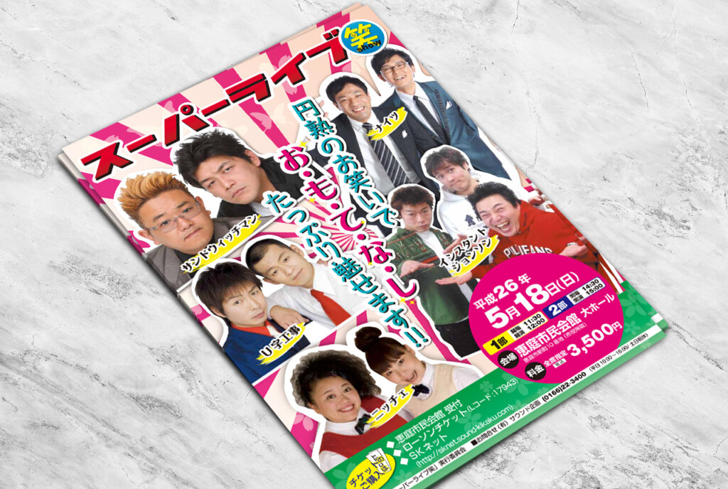 想いをこめて手がけたお仕事 スーパーライブ笑in恵庭 告知ツール制作 OTHERS スーパーライブ笑in恵庭のフライヤー、ポスター、チケットの制作を担当させていただきました。 BASIC INFORMATION スーパーライブ笑in恵庭 告知ツール制作 チラシ・フライヤー 主催:サウンド企画様